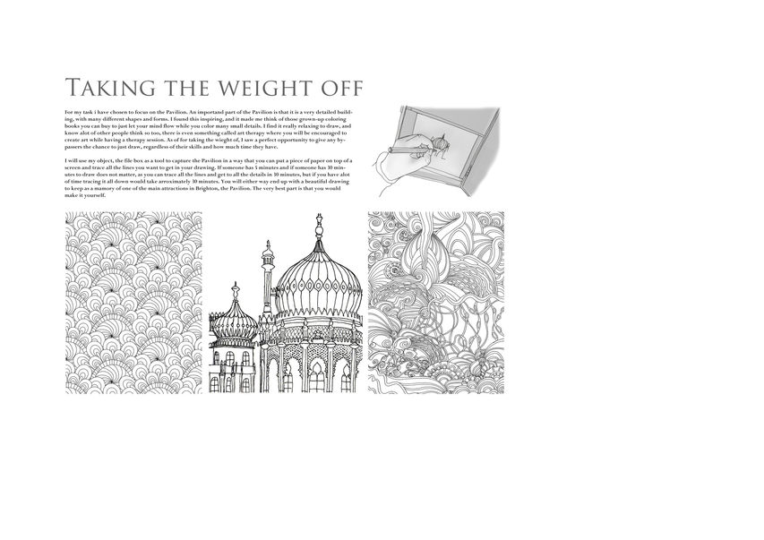 Oppgaven for denne porteføljen var, som lest i tittelen til denne porteføljen, Taking the weight off, eller å ta vekten av. Noen sentrale problemer ble nevnt, som ensomhet forårsaket av smarttelefoner og stress. Min oppgave var å finne en måte å løse dette på hvilken måte jeg ville, metaforisk, bokstavelig eller begge deler. Vi fikk et busskur i sentrum av Brighton kalt Old Steine, hvor vi skulle utvikle et passede program til å hjelpe forbipasserende å slappe av.
